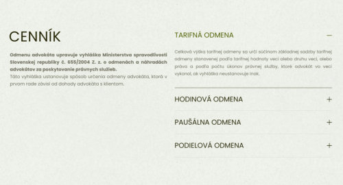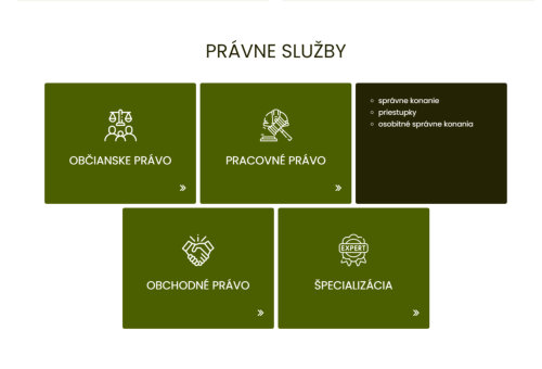 Flipbox: Interaktívny efekt použitý na stránke Právne služby, ktorý umožňuje zobraziť stručné informácie o právnych službách na prednej strane a po prevrátení sa zobrazia podrobnosti.